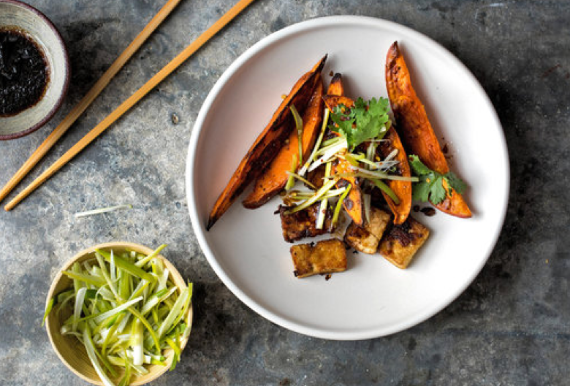 Tossing marinated tofu squares in cornstarch before roasting makes them wonderfully crunchy and brown. Here, the tofu is cooked alongside spears of sweet potato, which are soft and silky against the crisp squares. A tamari-honey dressing spiked with rice wine vinegar acts both as marinade for the tofu and sauce for the finished dish. Then quick-pickled scallions and hot sesame oil make for a bright and spicy garnish.
